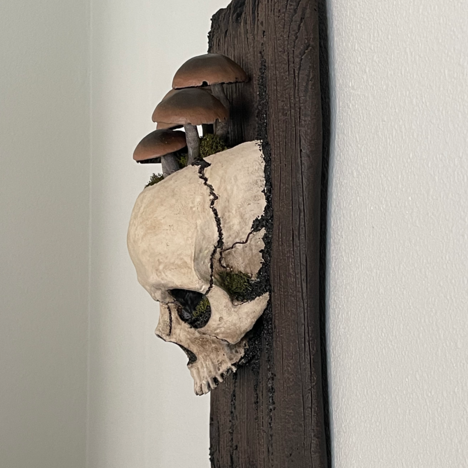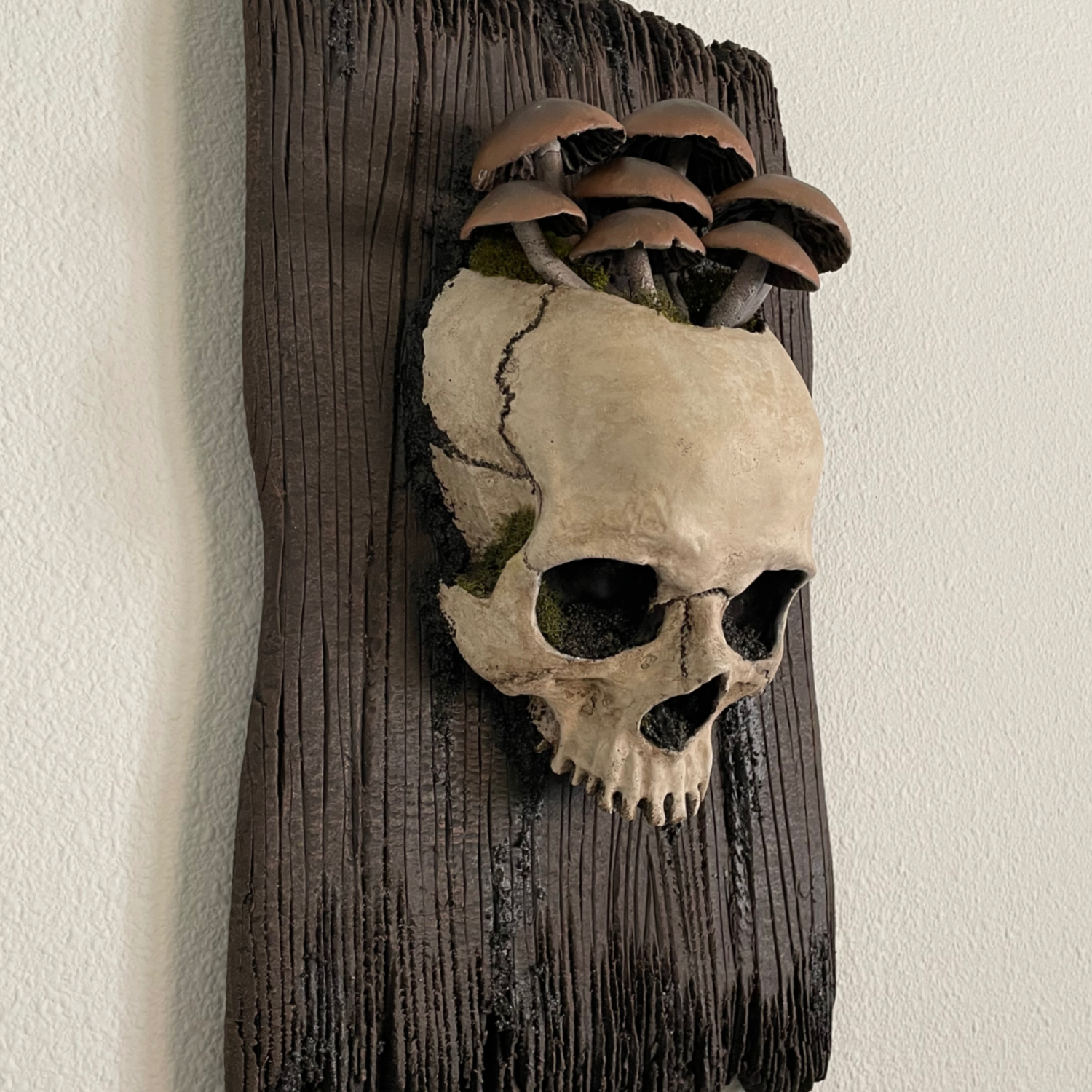 A great addition to any collection, this skull is cast from lightweight foam and mounted onto a faux "wooden" plaque. The skull is overrun with individually sculpted fungi. Each piece is hand-painted and weathered with acrylics. No two spores are alike, so each piece is truly unique.